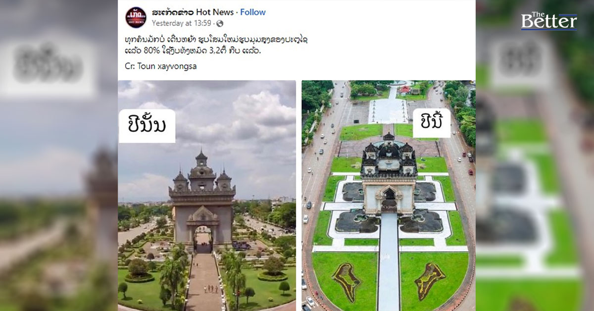 ในเพจสะเก็ดข่าว Hot News (ສະເກັດຂ່າວ Hot News) โพสต์คำถามว่า "ทุกคนชอบไหม สนามหญ้ารูปโฉมใหม่รูปมุมสูงของประตูชัย เสร็จแล้ว 80% ใช้งบทั้งหมด 3.2 ตื้อกีบแล้ว"