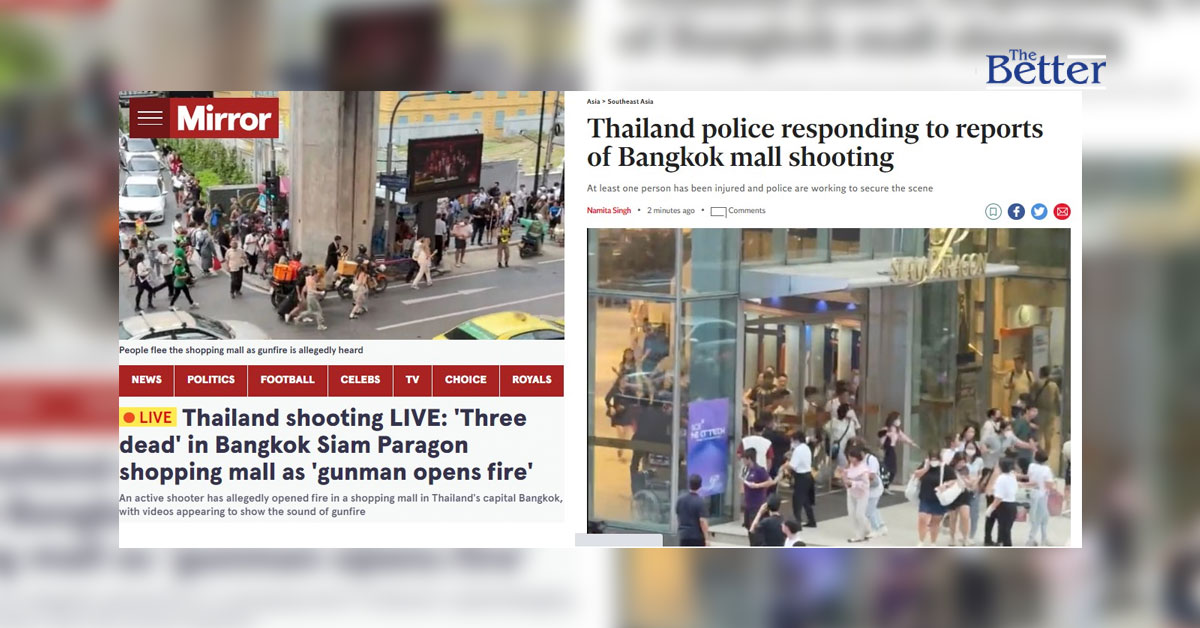 ในเพจไท่กั๋วหว่าง (泰国网) รายงานข่าวนี้ โดยระบุว่า "ข่าวด่วน! เกิดเหตุต้องสงสัยยิงที่สยามพารากอน กรุงเทพฯ ตามรายงานของสื่อไทยหลายราย เมื่อเวลาประมาณ 16.20 น. วันที่ 3 ต.ค. ตำรวจไทยได้รับแจ้งว่าได้ยินเสียงปืนในสยามพารากอน กรุงเทพฯ และฝูงชนในห้างสรรพสินค้าก็ตกใจกลัว พากันวิ่งกันอลหม่าน และเหตุการณ์นั้นก็วุ่นวายมาก"